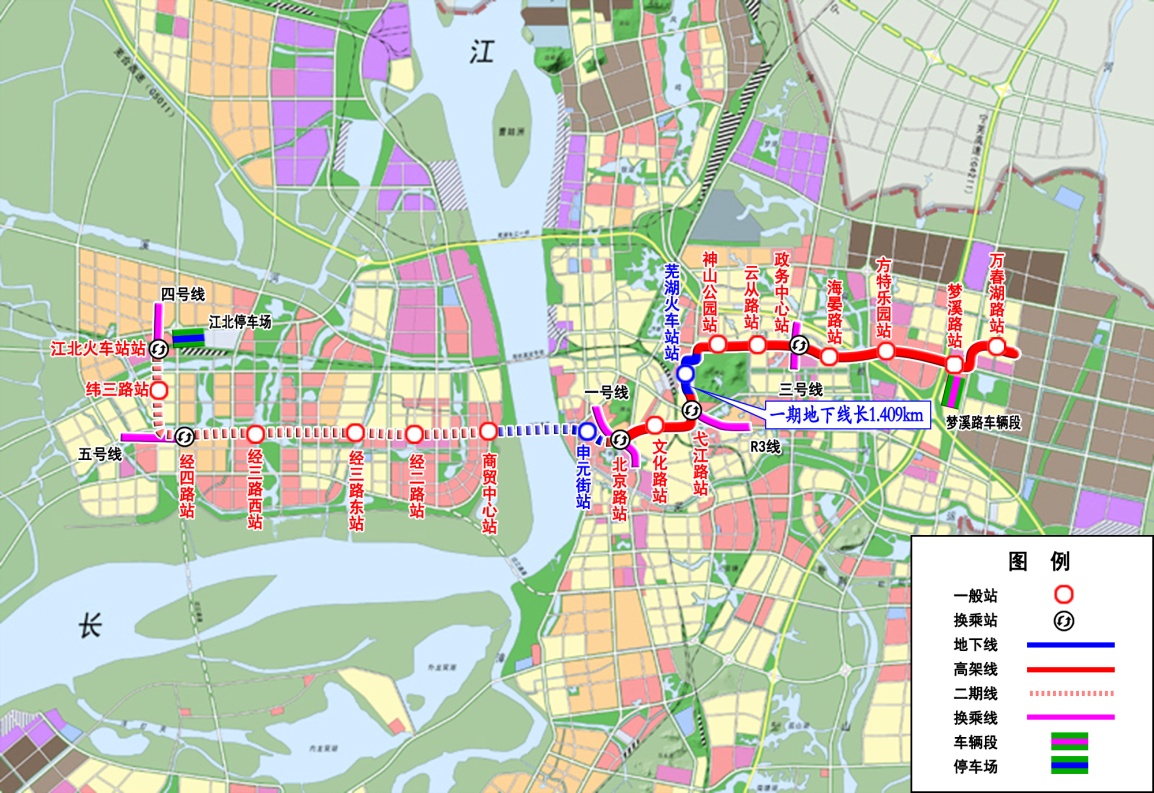 蕪湖市軌道交通1號線工程起于保順路站,終于白馬山站,呈南北走向,線路全長約30.460km,共設(shè)車站25座,全部為高架車站,其中換乘站3座。蕪湖市軌道交通2號線一期工程起于北京路站,終于萬春湖路站,呈東西走向,線路全長約15.796km,共設(shè)11座車站(高架站10座、地下站1座),換乘站3座。共設(shè)置停車場1處、車輛段2處, 2019年12月底建成,2020年1月初開通試運營,2021年正式運營。