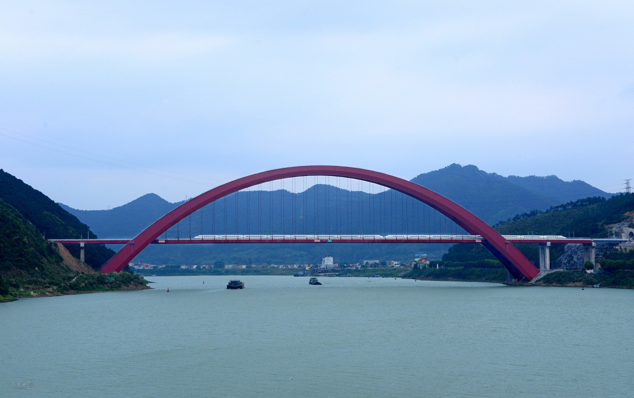 主跨450m的南廣鐵路西江特大橋是世界上最大跨度的高速鐵路鋼箱拱橋,設(shè)計(jì)中對(duì)“邊段豎轉(zhuǎn)+中段提升”、“纜索吊機(jī)節(jié)段懸拼”總體施工方案進(jìn)行了研究,結(jié)合“前臨西江,后靠陡峭山坡”的基礎(chǔ)工程特點(diǎn)提出了可承擔(dān)巨大水平力的新型基礎(chǔ)結(jié)構(gòu)形式和計(jì)算分析方法,解決了大跨度拱橋溫度變形大帶來(lái)的軌道鋪設(shè)精調(diào)和高速動(dòng)車組運(yùn)營(yíng)性能評(píng)判的技術(shù)難題,總體技術(shù)成果達(dá)到國(guó)際領(lǐng)先水平,獲國(guó)家發(fā)明專利,2016年榮獲“中國(guó)鋼結(jié)構(gòu)工程大獎(jiǎng)”。