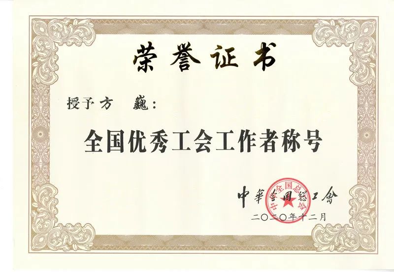 2020年獲中華全國總工會(huì)授予的“全國優(yōu)秀工會(huì)工作者”稱號
