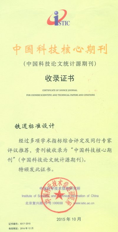10月21日,中國科學(xué)技術(shù)信息研究所在北京舉辦了“中國科技論文統(tǒng)計(jì)結(jié)果發(fā)布會”。會上發(fā)布了“2015中國科技期刊引證報(bào)告(核心版)”。中鐵咨詢集團(tuán)主辦的《鐵道標(biāo)準(zhǔn)設(shè)計(jì)》期刊被收錄為“中國科技核心期刊”,并被收入中國科技論文與引文數(shù)據(jù)庫(CSTPCD),這是自2006年以來《鐵道標(biāo)準(zhǔn)設(shè)計(jì)》期刊連續(xù)10年被中國科技核心期刊收錄。