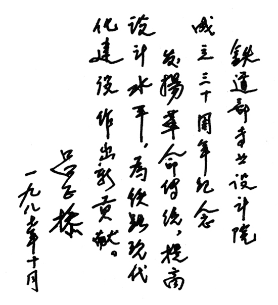 原全國政協(xié)副主席、鐵道部部長呂正操題詞(賀鐵道部專業(yè)設計院成立三十周年)
