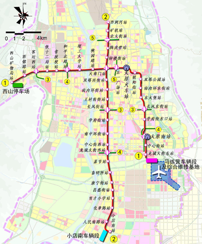 太原市軌道交通1號線一期工程起于西山礦務(wù)局,終于龍城大街東站,于太原市內(nèi)呈倒“L”形分布,東西向沿迎澤大街,途經(jīng)客運(yùn)西站、理工大學(xué)、大南門、柳巷、五一廣場、太原站等客流集中點(diǎn),南北向沿朝陽街、太行路、馬練營路敷設(shè),途經(jīng)朝陽街服裝城、雙塔公園、東太堡、太原南站綜合交通樞紐等地。1號線一期工程是聯(lián)系迎澤、武宿兩個(gè)市級中心和太原站、太原南站兩個(gè)鐵路交通樞紐的骨干線路,線路全長約24.07km,設(shè)橋梁1座,長約0.215km,其余全為地下線;共設(shè)置車站21座,全部為地下站,在線路西端設(shè)西山礦務(wù)局停車場1座、南端設(shè)馬練營車輛段及綜合維修基地1座,全線網(wǎng)共享控制中心1個(gè)。太原市軌道交通1號線于2010年完成工程可行性研究報(bào)告初稿,擬采用6輛編組的B型車、1500V接觸網(wǎng)供電,估算總投資157.9億元,計(jì)劃2013年開工建設(shè),2017年建成通車。1號線是太原市先期啟動(dòng)建設(shè)的軌道交通線路之一,是一條客流需求和規(guī)劃引導(dǎo)兼顧的大運(yùn)量線路,在太原市軌道交通線網(wǎng)中具有重要的地位和作用,其建設(shè)可改善迎澤和武宿兩大市級中心的居民出行條件,緩解中心城區(qū)交通壓力,對引導(dǎo)沿線城市健康有序發(fā)展、土地合理使用及加快城市化進(jìn)程等均有積極促進(jìn)作用。