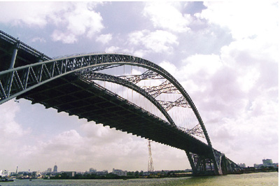丫髻沙大橋位于廣州市環(huán)城高速公路東南三環(huán),橫跨水流湍急的珠江航道,有76+360+76米三跨連續(xù)自錨中承式鋼管混凝土拱橋、86+160+86米三跨連續(xù)預(yù)應(yīng)力混凝土剛構(gòu)和6跨40米預(yù)應(yīng)力混凝土簡(jiǎn)支梁組成,全長(zhǎng)1084米,其主跨360米鋼管拱在當(dāng)時(shí)全世界同類型拱橋中名列第一,同時(shí)創(chuàng)造了橋梁綜合轉(zhuǎn)體世界第一的技術(shù)指標(biāo)。