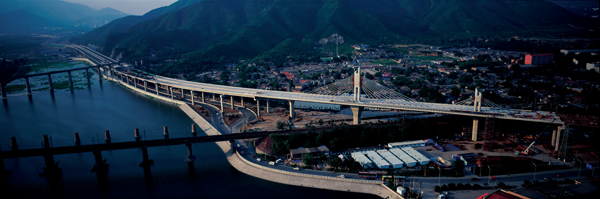 豐沙鐵路轉(zhuǎn)體斜拉橋位于北京市門頭溝區(qū)三家店村,是西六環(huán)項目建設(shè)中科技含量最高、施工工藝最為復(fù)雜、工期最為緊張的控制性工程, 主橋設(shè)計為56 +100 +70 +37米四跨連續(xù)雙圓柱子母塔單索面W形腹板截面預(yù)應(yīng)力混凝土曲線斜拉橋,橋梁全寬30.5米。結(jié)合本橋橋墩較高、體量較大的實際情況,因地制宜地采用了墩頂大噸位單鉸轉(zhuǎn)體施工工藝,主要技術(shù)指標為:墩高21.5米,轉(zhuǎn)體總長182米,平曲線半徑950米,單鉸轉(zhuǎn)體重量15000噸,轉(zhuǎn)體角度40度,是我國第一座采用墩頂轉(zhuǎn)體施工的橋梁,是世界上墩頂單鉸轉(zhuǎn)體噸位最大的橋梁。