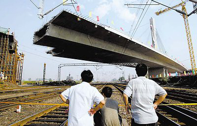 北京市五環(huán)路石景山南站特大橋主橋跨越石景山南站編組站咽喉區(qū),鐵路線間距小、行車(chē)密度大,為了既能快速、安全地在電氣化鐵路站場(chǎng)上加起高架橋,又可不干擾或盡量少干擾正常的鐵路運(yùn)輸。該橋主橋采用了轉(zhuǎn)體法施工的45+65+95+40m四跨連續(xù)獨(dú)塔單索面預(yù)應(yīng)力混凝土曲線先拉齊奧,轉(zhuǎn)體重量達(dá)14000噸。該橋或2005年度國(guó)家優(yōu)質(zhì)工程銀質(zhì)獎(jiǎng),2006年度建設(shè)部?jī)?yōu)秀設(shè)計(jì)一等獎(jiǎng),全國(guó)優(yōu)秀工程設(shè)計(jì)金質(zhì)獎(jiǎng)。