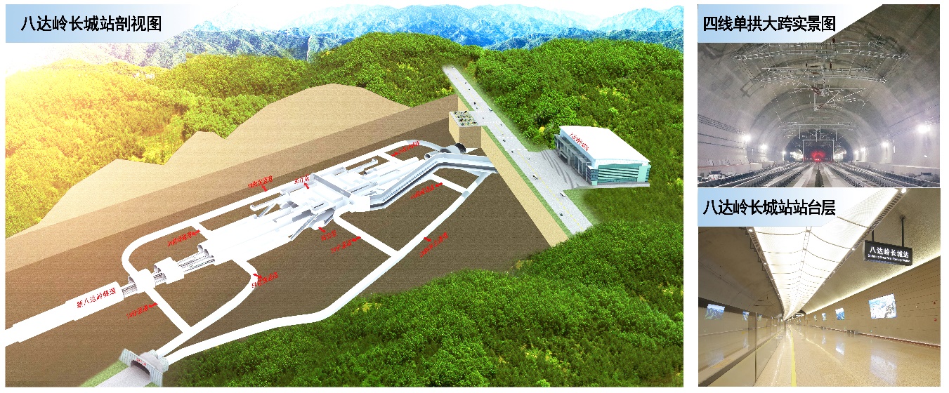 八達(dá)嶺長(zhǎng)城隧道地處八達(dá)嶺核心風(fēng)景區(qū),全長(zhǎng)12公里。八達(dá)嶺長(zhǎng)城站設(shè)在新八達(dá)嶺隧道內(nèi),車站為三層三縱結(jié)構(gòu)的復(fù)雜洞室群地下車站,相鄰洞室最小水平間距2.2米、最小垂直間距4.5米,最大埋深102米,站隧過(guò)渡段為超大跨結(jié)構(gòu),最大跨度32.7米,地下部分建筑面積4萬(wàn)平方米。中鐵設(shè)計(jì)研發(fā)了超大跨松散圍巖隧道修建技術(shù),解決了深埋地下站防災(zāi)救援疏散、舒適環(huán)境構(gòu)建、小凈距洞群穩(wěn)定及超長(zhǎng)耐久性等系列難題,實(shí)現(xiàn)了世界上埋深最深、規(guī)模最大的全暗挖站隧一體高鐵車站。