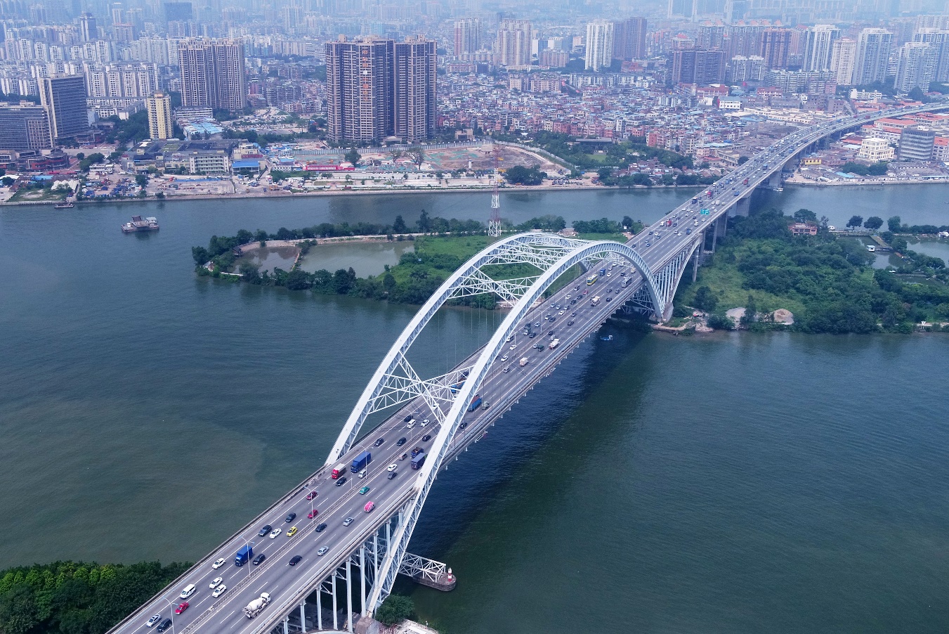 廣州市丫髻沙大橋,位于廣州市主城區(qū)西南部,跨越珠江主、副航道和丫髻沙島,全長1084米。主橋采用(76+360+76)米三跨連續(xù)自錨式鋼管混凝土拱橋,跨越副航道采用(86+160+86)米三跨連續(xù)預(yù)應(yīng)力混凝土剛構(gòu)橋,全橋橫向布置雙向六車道,2000年6月建成。